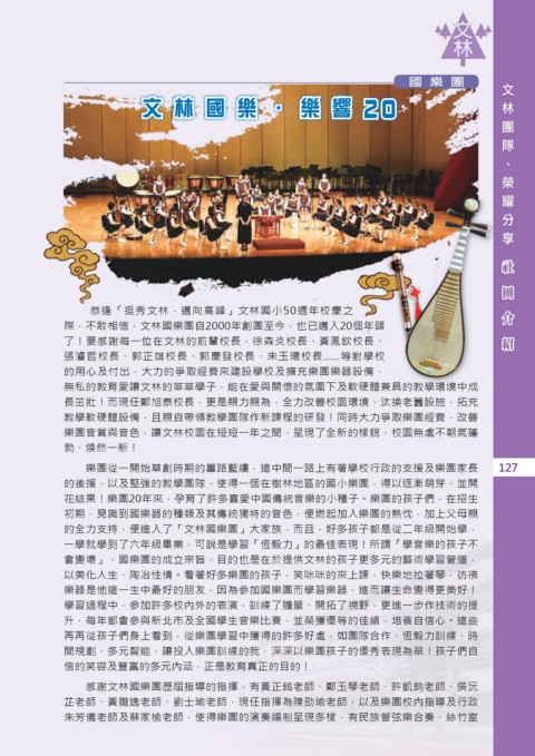126 樂團從一開始草創時期的篳路藍縷,這中間一路上有著學校行政的支援及樂團家長 127