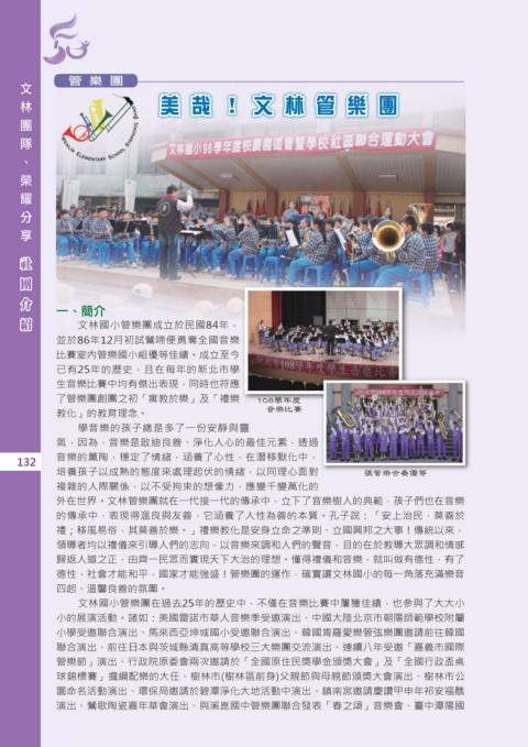 外在世界。文林管樂團就在一代接一代的傳承中,立下了音樂樹人的典範,孩子們也在音樂 89年03月 第三度參加台灣區音樂比賽,榮獲優等獎項