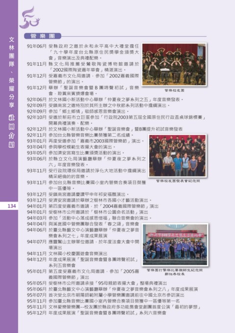 134 94年01月 第四度受嘉義市邀請,於「2004嘉義國際管樂節」演出 97年09月 文林愛樂管樂團--校友團於臺北縣政府多 管樂團至日本東京與清真學園管樂 135