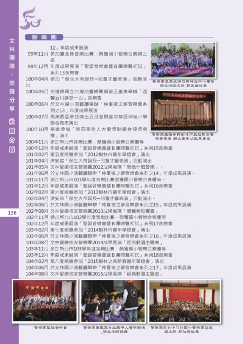 136 102年08月 文林愛樂校友管樂團2013成果展演「懷舊老歌饗宴」 107年11月 參加新北市音樂比賽,榮獲國小打擊樂合奏優等第一名代表新北市參加全國賽 137