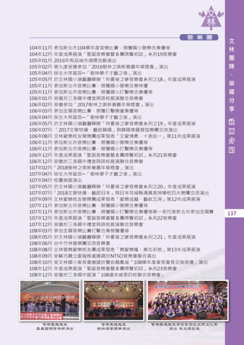 136 102年08月 文林愛樂校友管樂團2013成果展演「懷舊老歌饗宴」 107年11月 參加新北市音樂比賽,榮獲國小打擊樂合奏優等第一名代表新北市參加全國賽 137