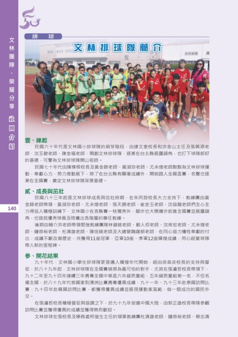 民國六十年代是文林國小排球隊的萌芽階段,由連文奎校長和洪金山主任及張興源老 有多元學習與強壯的體魄,培養認真、負責、有毅力、有抗壓的態度與能力,讓學生有全方