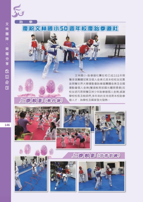 團 隊 文 林 分 享 耀 、 榮 跆 拳 慶祝文林國小 50 週年校慶跆拳道社 介 團 社 紹 文林國小-跆拳道社團在校已成立11年榮 獲多項團體冠軍及個人金牌尤其本校校友莊貫 渝榮獲世界大學運動會跆拳道團體金牌及全國 運動會個人金牌(獲頒教育部國光體育獎章)另 校友胡巧恩榮獲亞洲少年跆拳道個人金牌,感謝 學校校長及教師們,多年來的支持培育本校跆拳 上課剪影 (熱身操) 道人才,為學校及國家發光發熱。 146 上課剪影 (技術訓練)