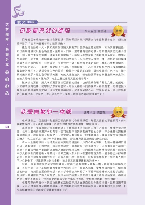我最喜歡的一堂課 四年六班 陳言碩 優等 最難忘的一件事 四年七班 李欣恩 優等