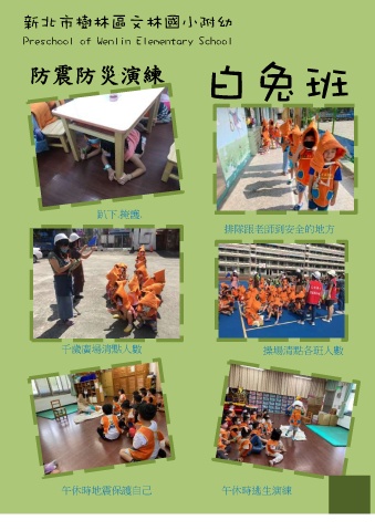 新北市樹林區文林國小附幼 Preschool of Wenlin Elementary School 白兔班 防震防災演練 趴下.掩護. 排隊跟老師到安全的地方 穩住 千歲廣場清點人數 操場清點各班人數 午休時地震保護自己 午休時逃生演練