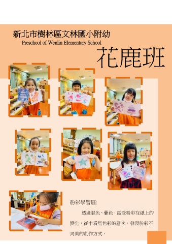 新北市樹林區文林國小附幼 Preschool of Wenlin Elementary School 花鹿班 粉彩學習區: 透過混色、疊色,感受粉彩在紙上的 變化,從中看見色彩的層次,發現粉彩不 同美的創作方式。