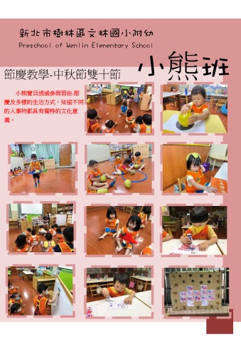 新北市樹林區文林國小附幼 Preschool of Wenlin Elementary School 小熊班 節慶教學-中秋節雙十節 小熊寶貝透過參與習俗.節 慶及多樣的生活方式,知道不同 的人事物都具有獨特的文化意 義。