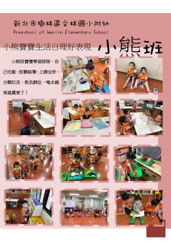 新北市樹林區文林國小附幼 Preschool of Wenlin Elementary School 小熊班 小熊寶寶生活自理好表現 小熊班寶寶學習排隊、自 己吃飯、放聯絡簿、上課坐好、 分類玩具、教具歸位、喝水越 來越厲害了!