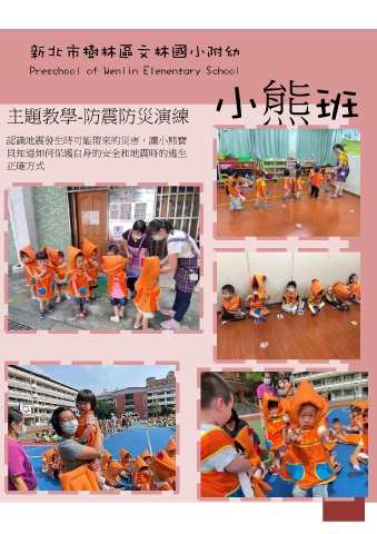 新北市樹林區文林國小附幼 Preschool of Wenlin Elementary School 小熊班 主題教學-防震防災演練 認識地震發生時可能帶來的災害,讓小熊寶 貝知道如何保護自身的安全和地震時的逃生 正確方式