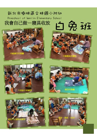 新北市樹林區文林國小附幼 Preschool of Wenlin Elementary School 我會自己做—寢具收放 白兔班 示範寢具的摺疊 示範寢具的擺放 寢具的摺疊 大家動手來練習 摺好,抱起,完成! 看我可以摺得這麼好 示範寢具的摺疊