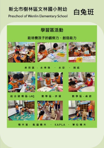學習區活動 能培養孩子的觀察力、創造能力 美 勞 區 - 水 串 珠 、 水 彩 、 捲 紙 組 合 建 構 區- LAQ 數 學 區 - 拼 圖 數 學 區 - 桌 遊 積 木 區 - 軌 道 積 木 、 K A P L A 、 單 位 積 木
