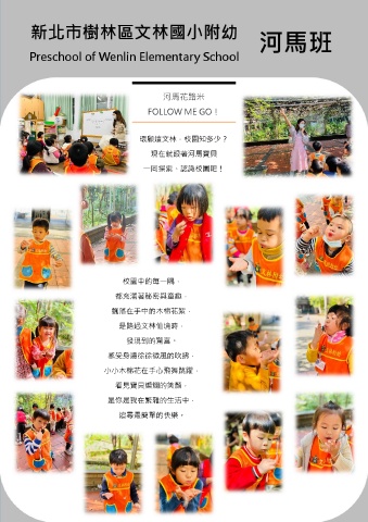 河馬花路米 FOLLOW ME GO! 環顧這文林,校園知多少? 現在就跟著河馬寶貝 一同探索、認識校園吧! 校園中的每一隅, 都充滿著秘密與童趣, 飄落在手中的木棉花絮, 是路過文林仙境時, 發現到的驚喜。 感受身邊徐徐微風的吹拂, 小小木棉花在手心飛舞跳躍, 看見寶貝燦爛的笑顏, 是你是我在繁雜的生活中, 追尋最簡單的快樂。