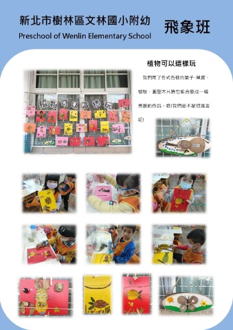 植物可以這樣玩 我們用了各式各樣的葉子、果實、 樹枝、圓型木片將它組合變成一幅 美麗的作品。瞧!我們是不是很厲害 呢!