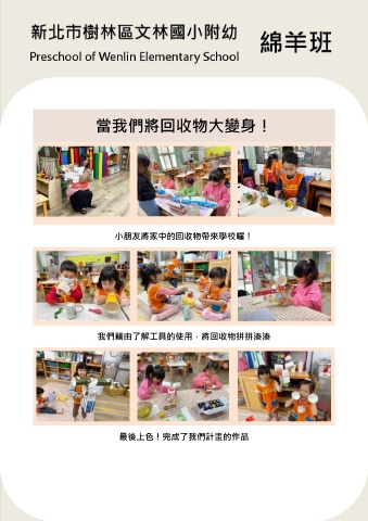 當我們將回收物大變身! 小朋友將家中的回收物帶來學校囉! 我們藉由了解工具的使用,將回收物拼拼湊湊 最後上色!完成了我們計畫的作品