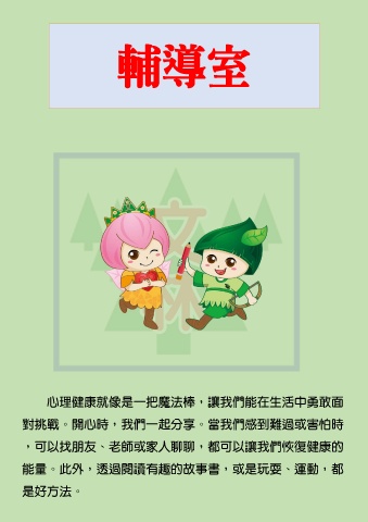 輔導室 心理健康就像是一把魔法棒,讓我們能在生活中勇敢面 對挑戰。開心時,我們一起分享。當我們感到難過或害怕時 ,可以找朋友、老師或家人聊聊,都可以讓我們恢復健康的 能量。此外,透過閱讀有趣的故事書,或是玩耍、運動,都 是好方法。